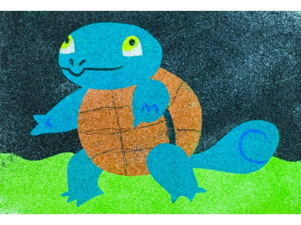 Tato šablona na pískování zachycuje roztomilé stvoření inspirované přírodou. Díky barevnému písku můžeš vytvořit krásně zelený lístek, želvičku v přírodních tónech a dodat obrázku živý a hravý vzhled.