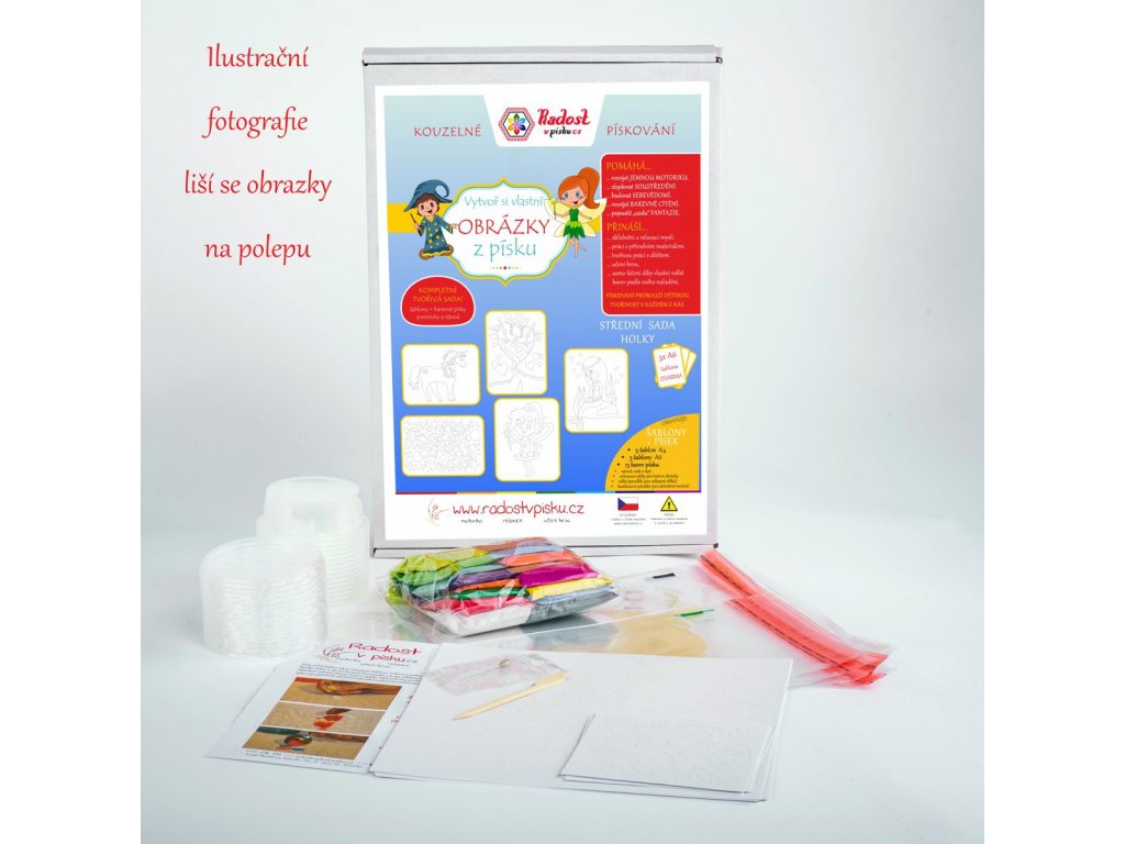 Šablony, dostatek barevného písku (cca pro 20-25 šablon), obaly na šablony, pomůcky a návod pro pískování. Složení obrázků můžete vidět na úvodní fotografii. Šablony jsou vhodně namíchané podle našich zkušeností z kreativní dílničky a vašich nejoblíbenějších obrázků.
