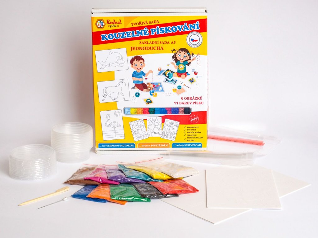 Šablony, dostatek barevného písku (cca pro 20-25 šablon), obaly na šablony, pomůcky a návod pro pískování. Složení obrázků můžete vidět na úvodní fotografii. Šablony jsou vhodně namíchané podle našich zkušeností z kreativní dílničky a vašich nejoblíbenějších obrázků.