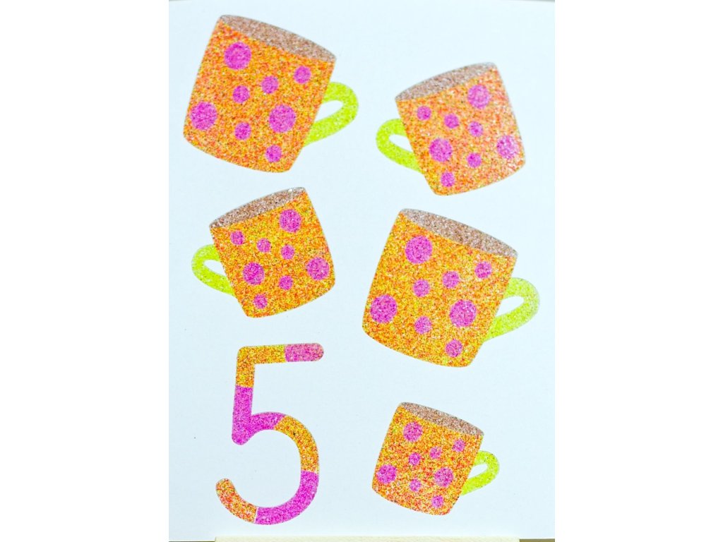 Pět kouzelných hrníčků, pět prstíků na ruce – číslo 5 je všude kolem nás! Tato šablona na pískování přináší dětem radost z objevování čísel pomocí barevného písku, který promění učení v kouzelnou hru plnou fantazie.