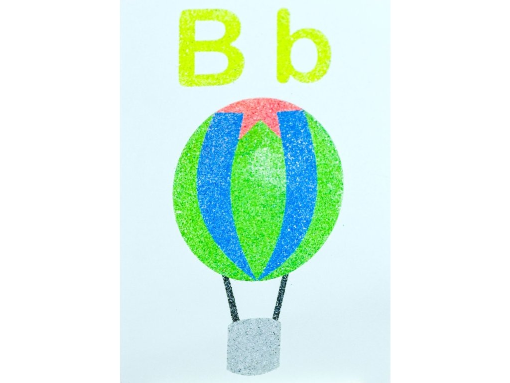 Vysoko nad krajinou se vznáší balón, který sebou nese i tajemství písmene B. Tato šablona na pískování propojuje poznávání abecedy s kouzlem barevného písku, který dětem pomůže zapamatovat si tvar písmene hravým a tvůrčím způsobem.