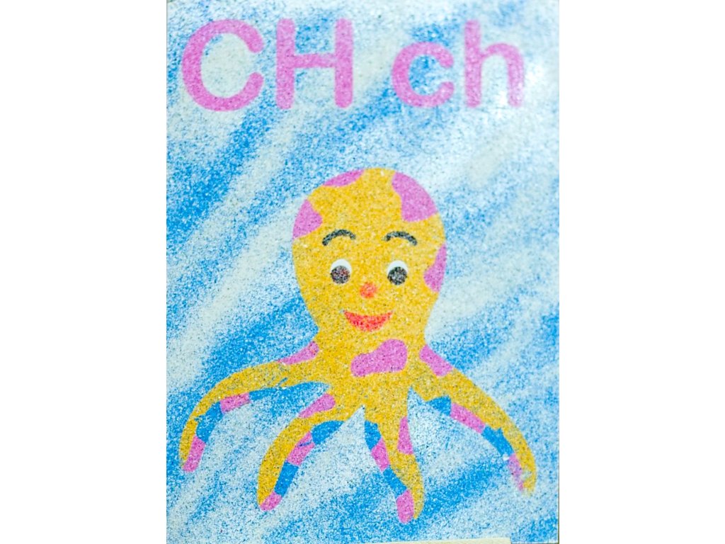 Pod zářivým písmem CH se rozprostírá kouzelná scéna, kde usměvavá chobotnice oslavuje radost z kreativního tvoření. Použijte barevný písek a proměňte šablonu v umělecké dílo, které děti pozve k hravému poznávání okolního světa.