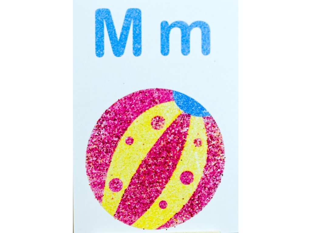 Míč se kutálí po stránce, odráží se od fantazie a zastavuje se u písmena M, které čeká na své barvy. Tato šablona na pískování spojuje zábavu s učením a díky barevnému písku promění každé písmeno v hravý zážitek plný barev.