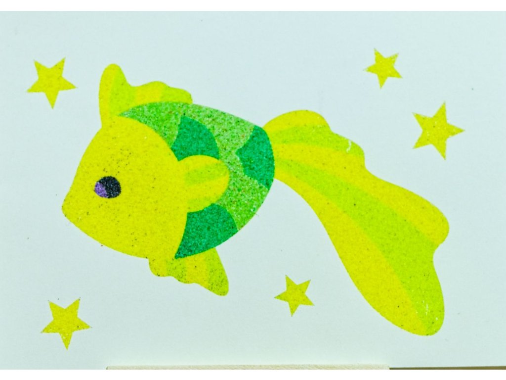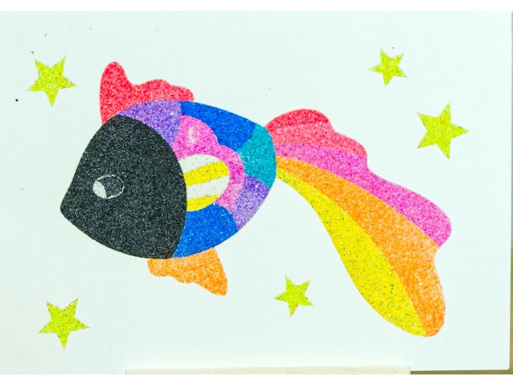 Na odkrytou část lepící plochy nasypeme písek dle vlastního výběru. Volit lze z více než 50 barevných odstínů, třpytek nebo svíticího písku. Písek lze aplikovat pomocí prstů či různých nástrojů včetně obyčejné lžičky.