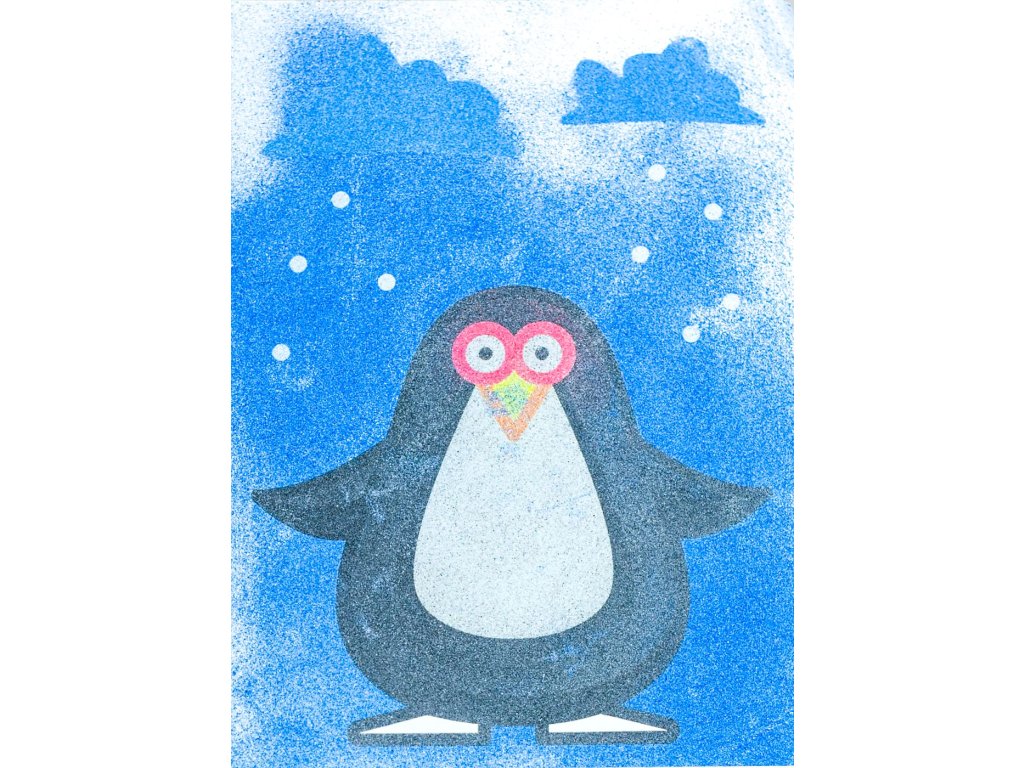 Tato šablona na pískování zachycuje roztomilého tučňáka s kulatým bříškem a veselým výrazem. Díky barevnému písku můžeš vytvořit kontrast mezi jeho černobílým peřím, modrým ledovým pozadím a třeba i barevnou šálou, čímž obrázek získá kouzelnou zimní atmosféru.