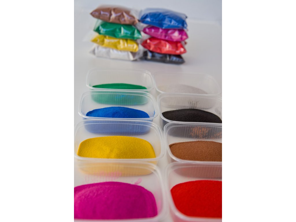 - 8x barevný písek - černá, bílá, červená, modrá, zelená, citrónová, růžová, hnědá