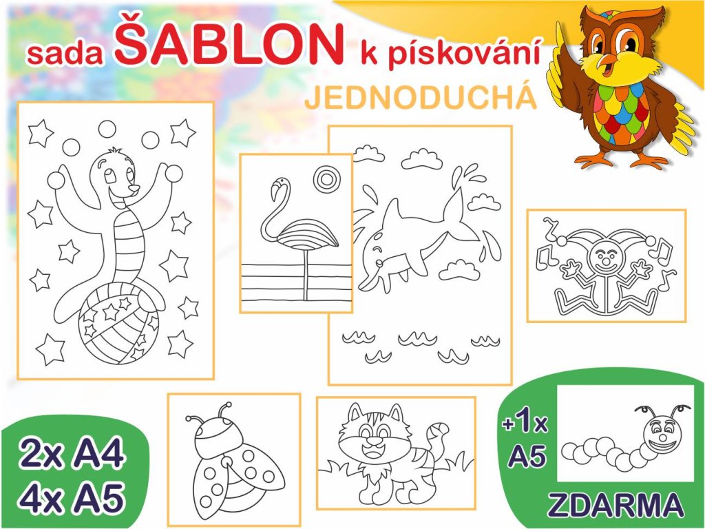Už nemusíte zdlouhavě vybírat jednotlivé motivy – přinášíme sadu oblíbených šablon s motivy nejmenší, které mají velmi jednoduché tvary a velké oblasti k tvoření s barevným pískem v jednom praktickém balení!