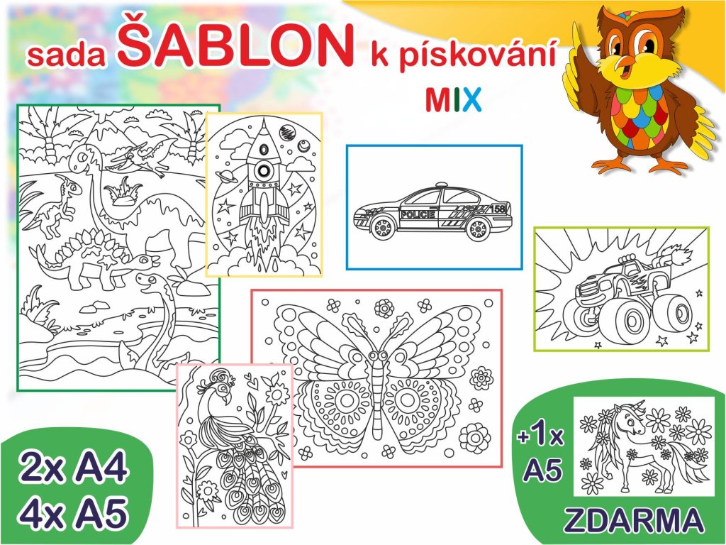 Už nemusíte zdlouhavě vybírat jednotlivé motivy – přinášíme sadu oblíbených šablon s motivy pro kluky i holky k tvoření s barevným pískem v jednom praktickém balení!
