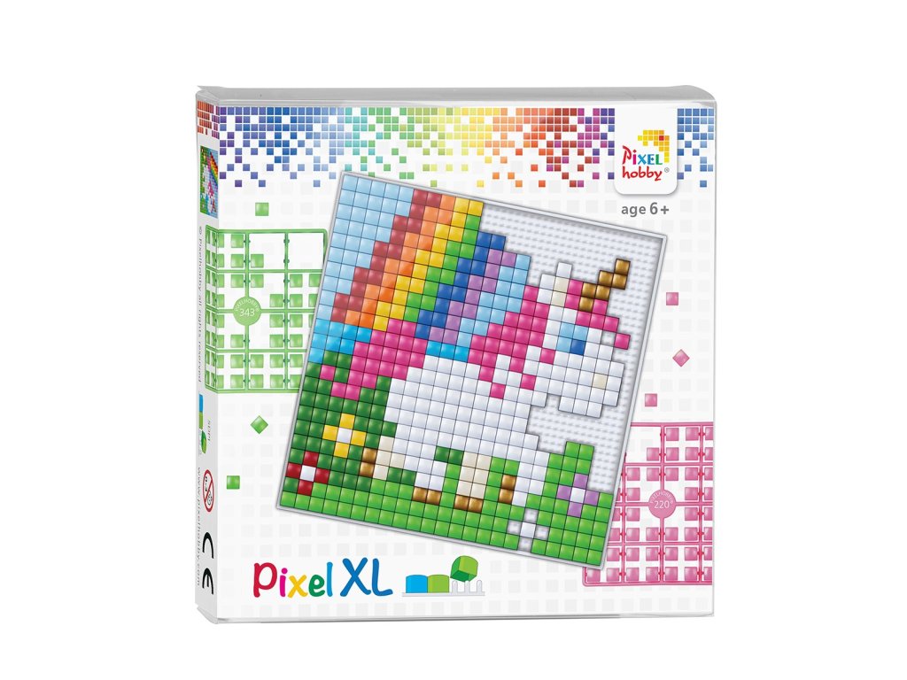 XL Pixel set je o něco náročnější pixelová sada pro děti (od 4 do cca 7 let). Tyto XL pixelové sety obrázky jsou čtyřikrát větší a obsahují více barev než Pixel set XL - základní . Pixely XL se nasazují na flexibilní čtvercovou základní desku s okrajem. Obrázek má rozměr 12 x 12 cm. Alternativně můžete vždy objednat základní desky, XL pixely a šablony samostatně.