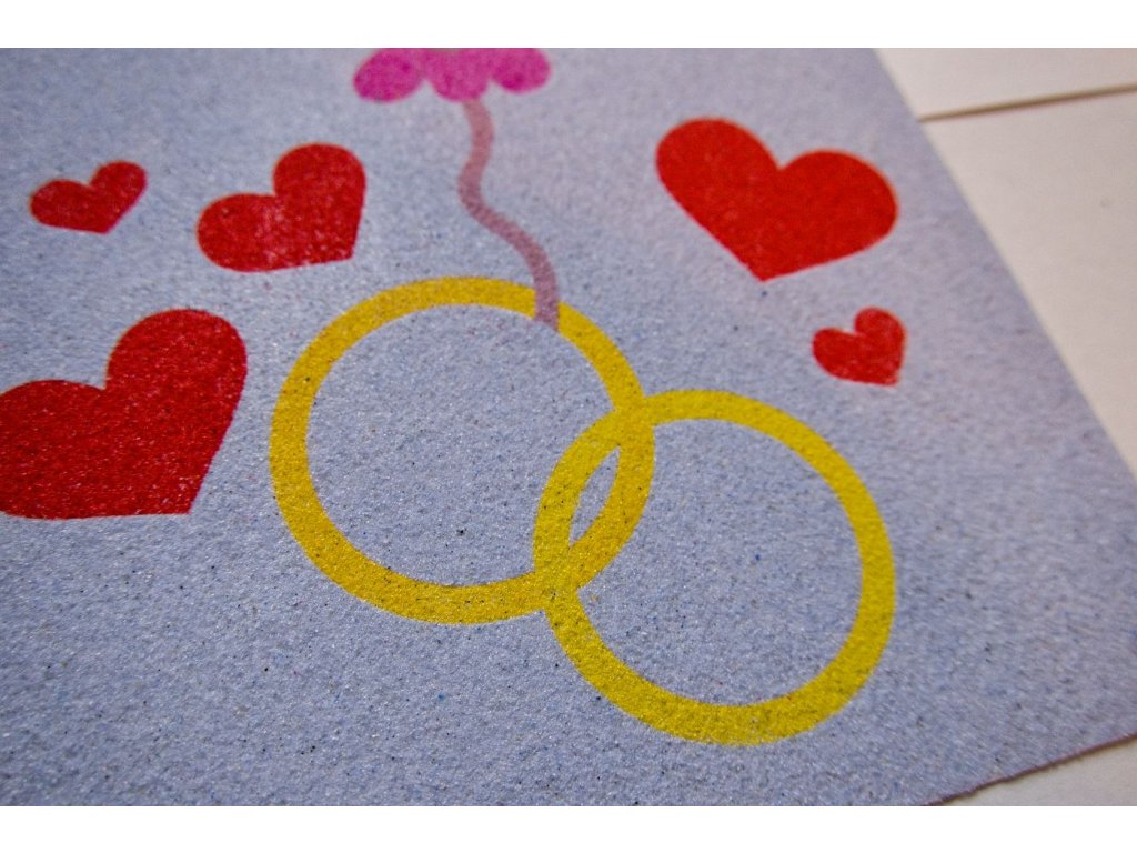 Tato šablona na pískování zachycuje detail snubních prstenů. Díky barevnému písku můžeš zvýraznit lesk kovu, třpyt kamínků a vytvořit motiv plný romantiky a slavnostní atmosféry.