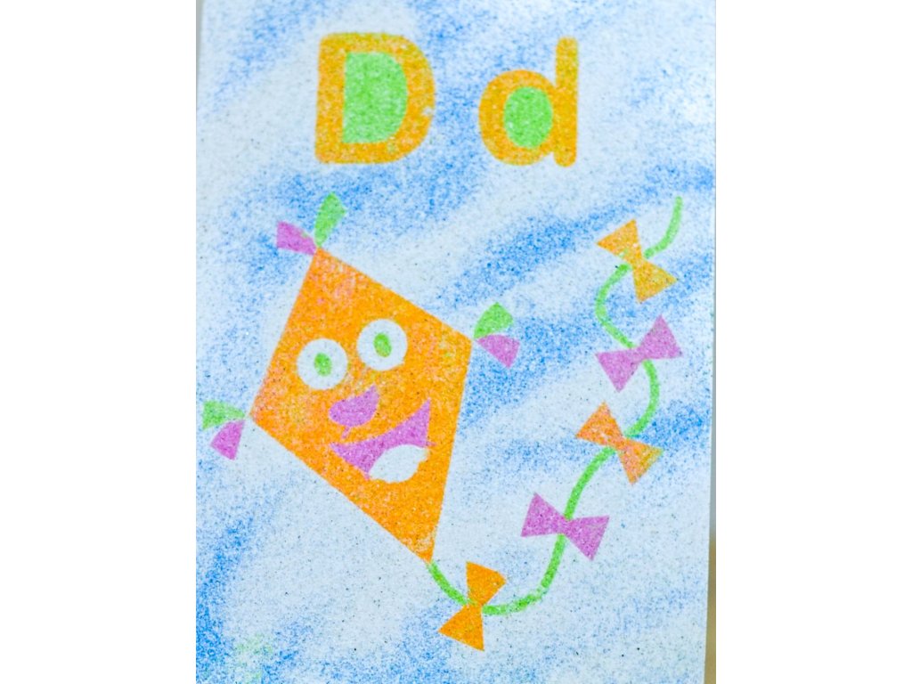 Vítr si pohrává s mašličkami, drak se směje a spolu s ním letí i písmeno D. Tato šablona na pískování propojuje hravé učení s tvořivostí – děti si zapamatují nové písmeno a pomocí barevného písku rozzáří draka svými oblíbenými barvami.