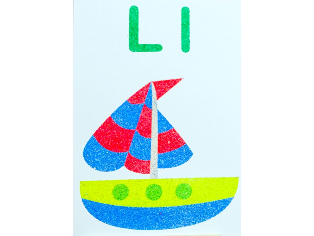 Loďka se houpe na vlnách, vítr jí pomáhá vpřed a písmeno L ji věrně doprovází na cestě za barvami. Tato šablona na pískování spojuje učení s fantazií a díky barevnému písku děti nechá objevit písmena v roli malých námořníků.