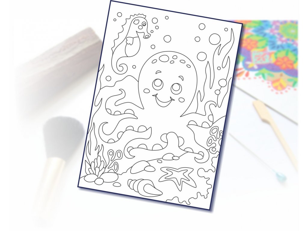 Tato šablona na pískování zachycuje hravou chobotnici, která jemně natahuje chapadlo k mořskému koníkovi v oceánských hlubinách. Díky barevnému písku můžeš vytvořit živou mořskou scenérii plnou odstínů modré, fialové a oranžové.