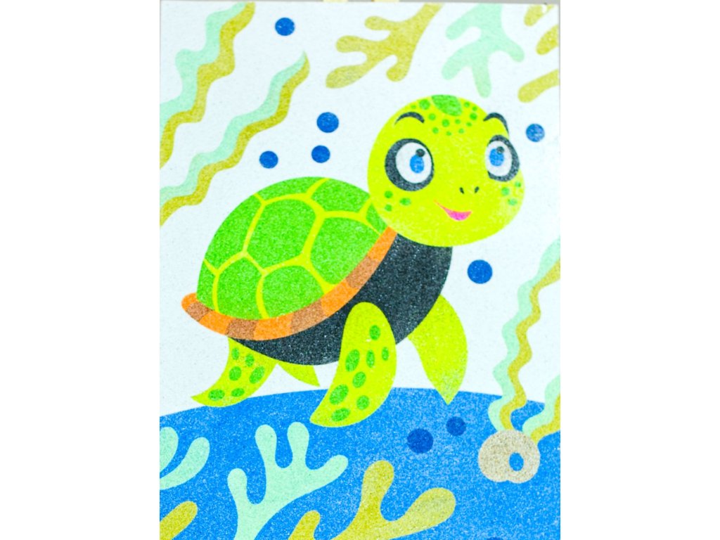 Na odkrytou část lepící plochy nasypeme písek dle vlastního výběru. Volit lze z více než 50 barevných odstínů, třpytek nebo svíticího písku. Písek lze aplikovat pomocí prstů či různých nástrojů včetně obyčejné lžičky.